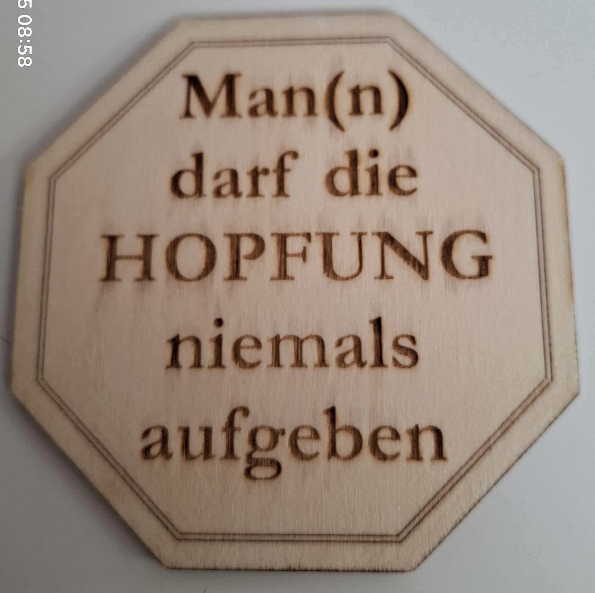 Der Untersetzer aus Pappelsperrholz ist nach dem lasern mit Versiegelungslack eingelassen.